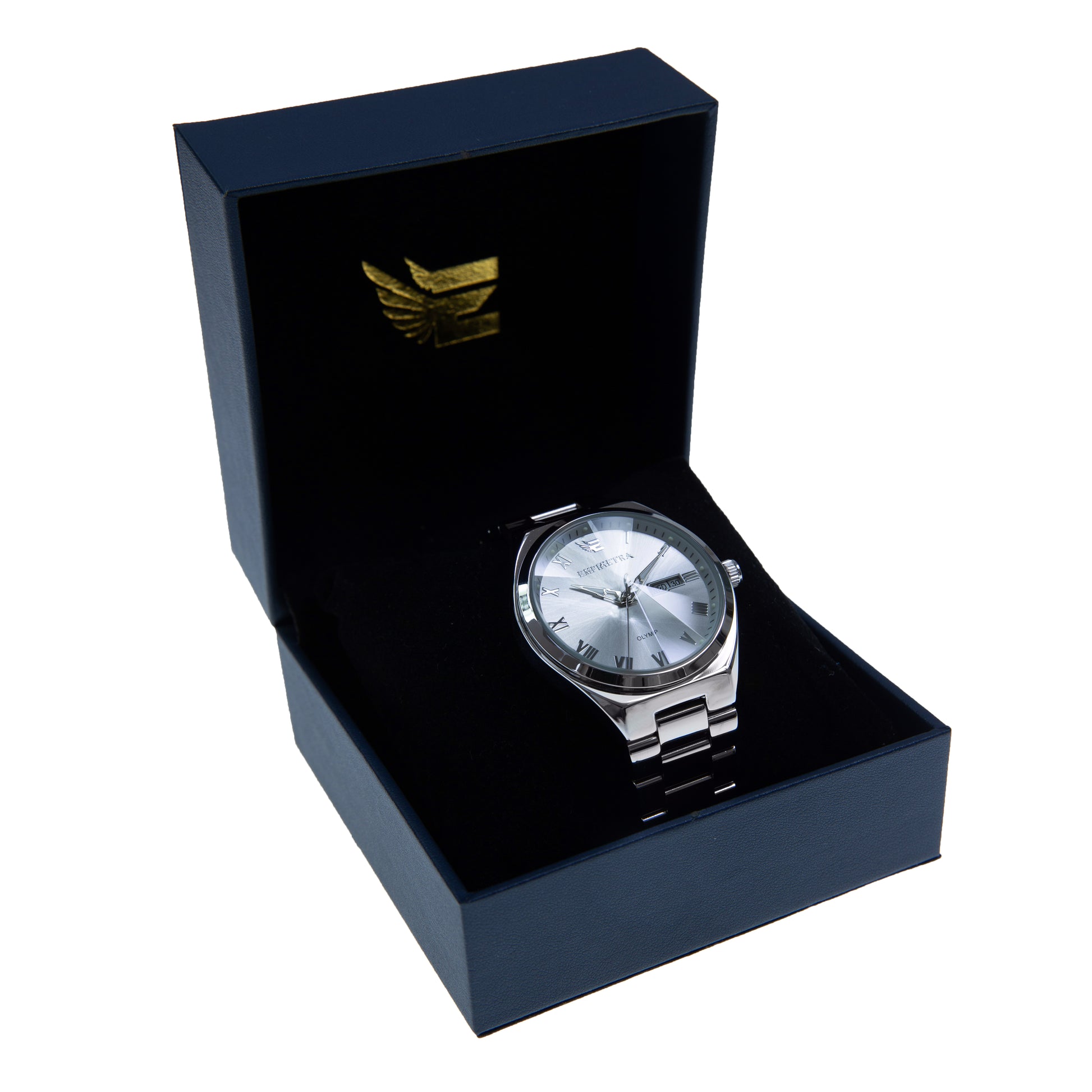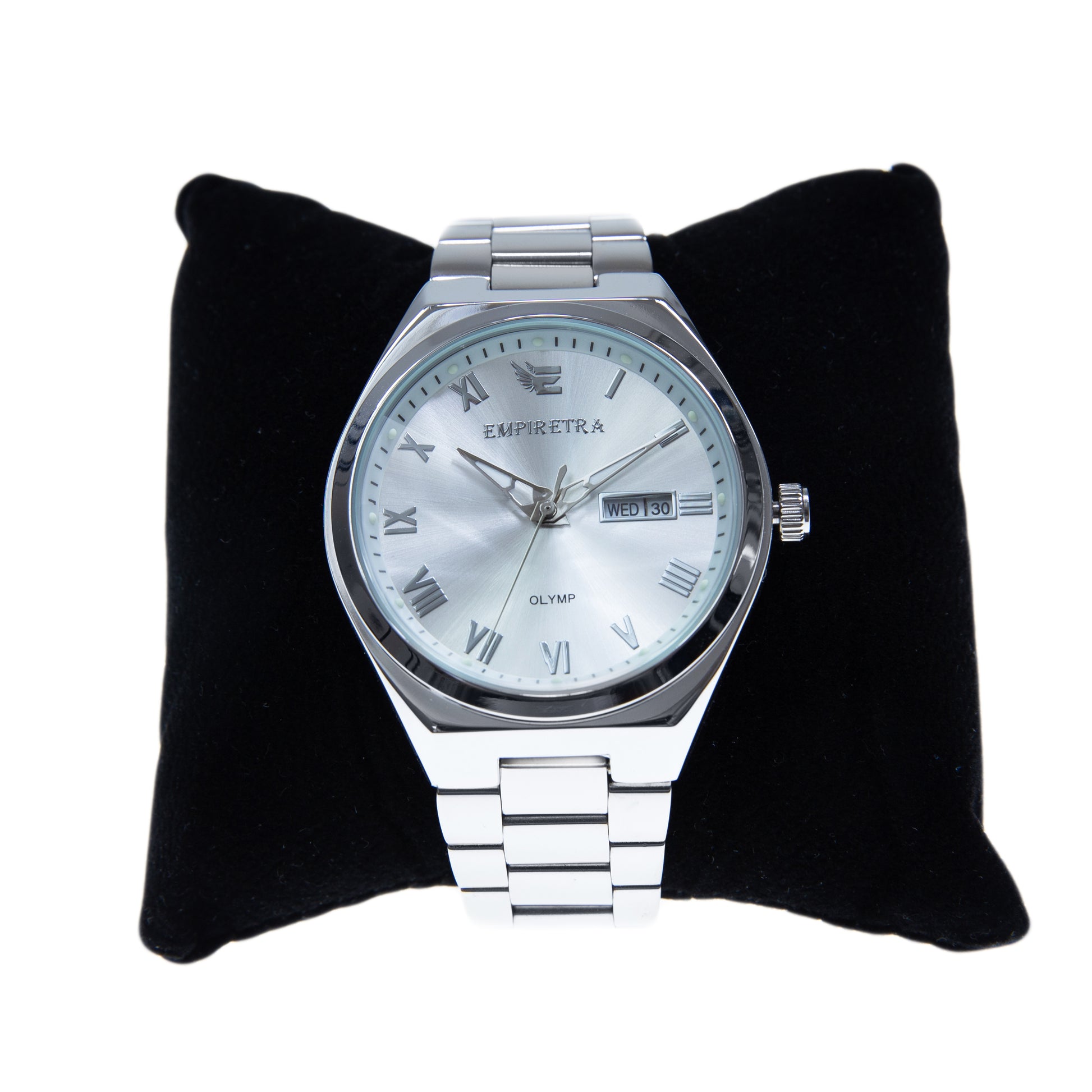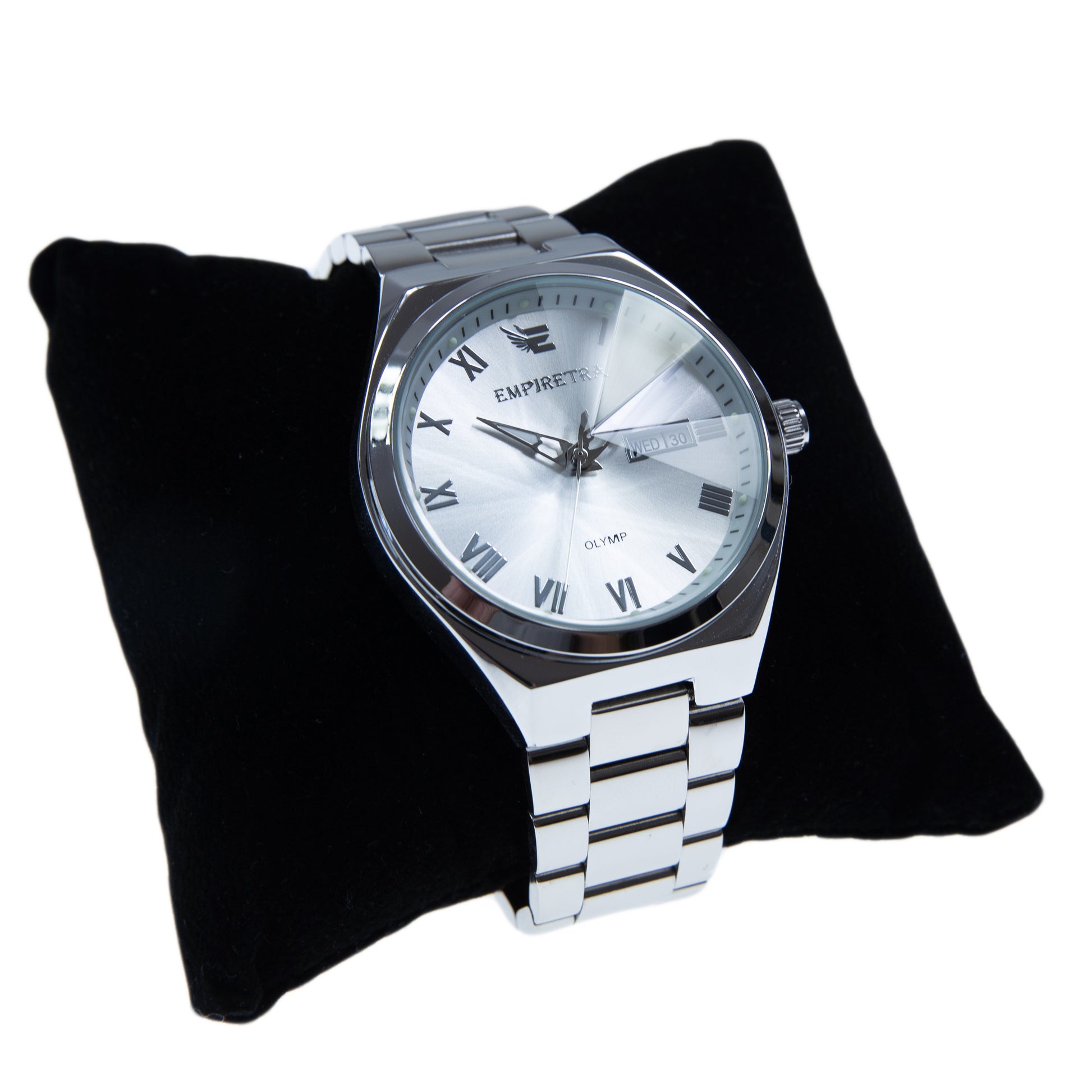 Die Uhr ist komplett silberfarben, mit einem markanten, diamantförmigen Frontglas, welches das Licht eindrucksvoll bricht. Das 42mm Gehäuse aus Edelstahl verleiht ihr Präsenz, ohne protzig zu wirken. Das 20mm breite Armband sorgt für Tragekomfort.